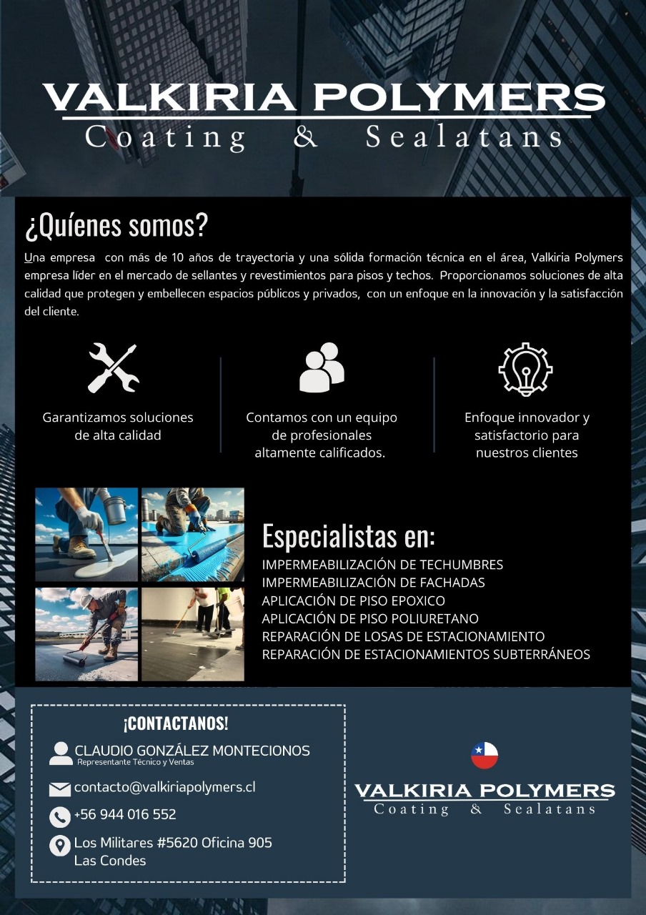 En Valkiria Polymers, nos dedicamos a ofrecer soluciones innovadoras en selladores y recubrimientos. Con una pasión por la calidad y la durabilidad, nuestros productos están diseñados para superar las expectativas y proporcionar el mejor desempeño en una amplia gama de aplicaciones.
